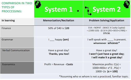 System 1 is the automatic or instinctive way of processing information, and System 2 is the analytical and well-reasoned approach. Although distinct, both systems play equally essential roles in language learning.